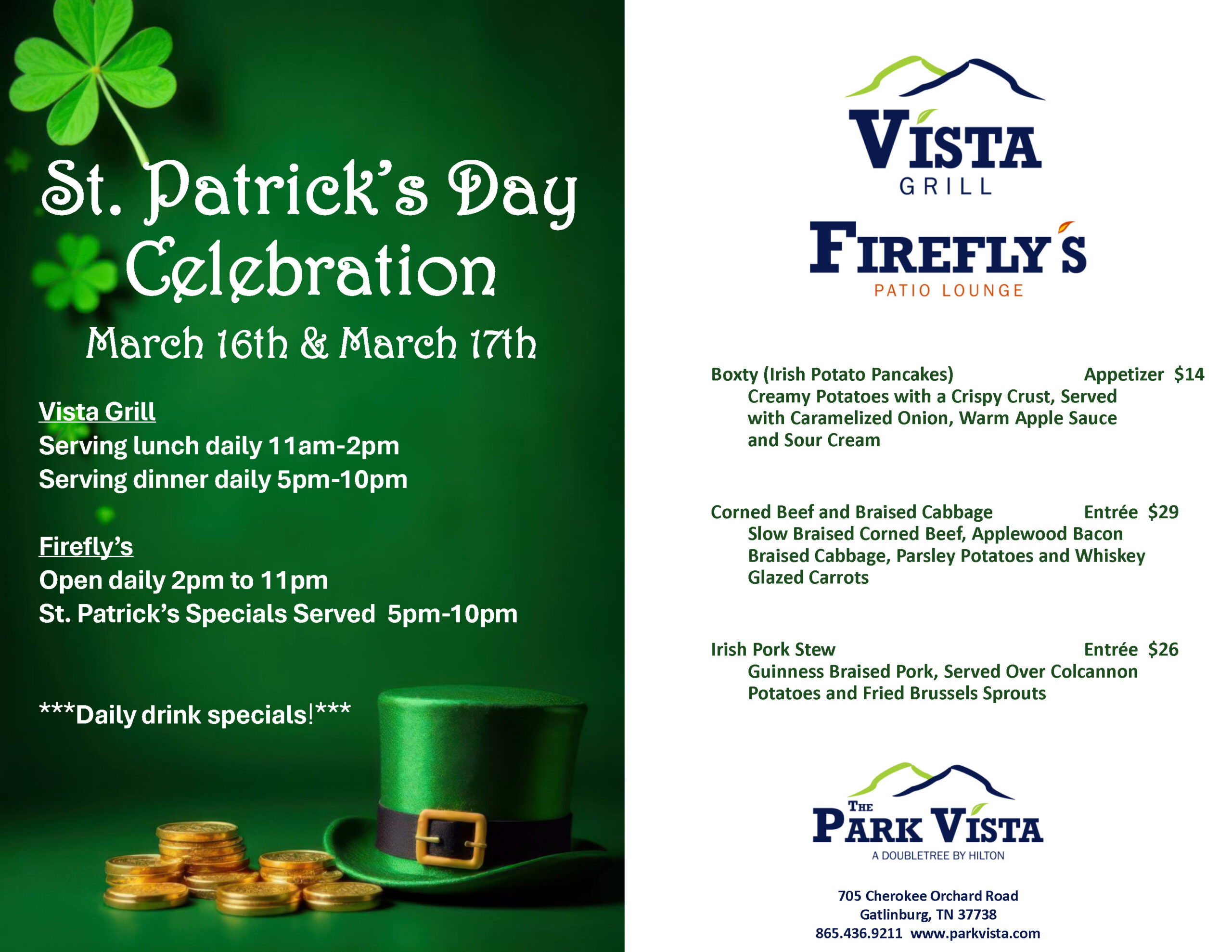 Vista Grill and Firefly’s Patio Lounge will be celebrating St. Patrick’s Day with two days of fabulous food and drink.