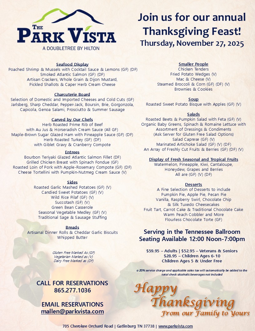 We promise there is nothing like experiencing this amazing feast! The Park Vista truly offers the most fabulous Thanksgiving spread available in the Smoky Mountains. Our Culinary team has once again crafted a menu fit for any demanding appetite and is sure to please every picky palate in your family!